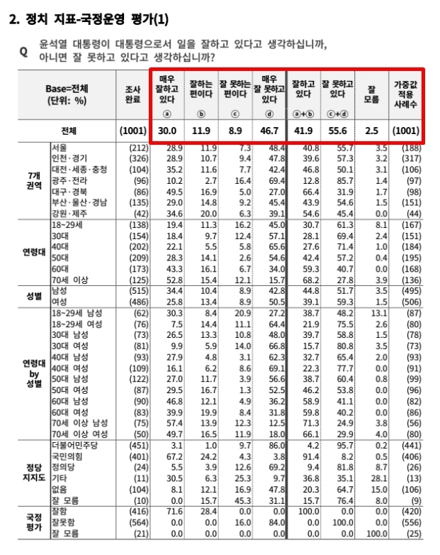 위의 설명과 같이 기본적인 여론조사의 설계 요소들은 당연히 나와있고, 여론조사의 질문 내용과 구성 등 언론 보도에는 자세히 설명되지 않는 상세한 자료들도 공개되어 있다.