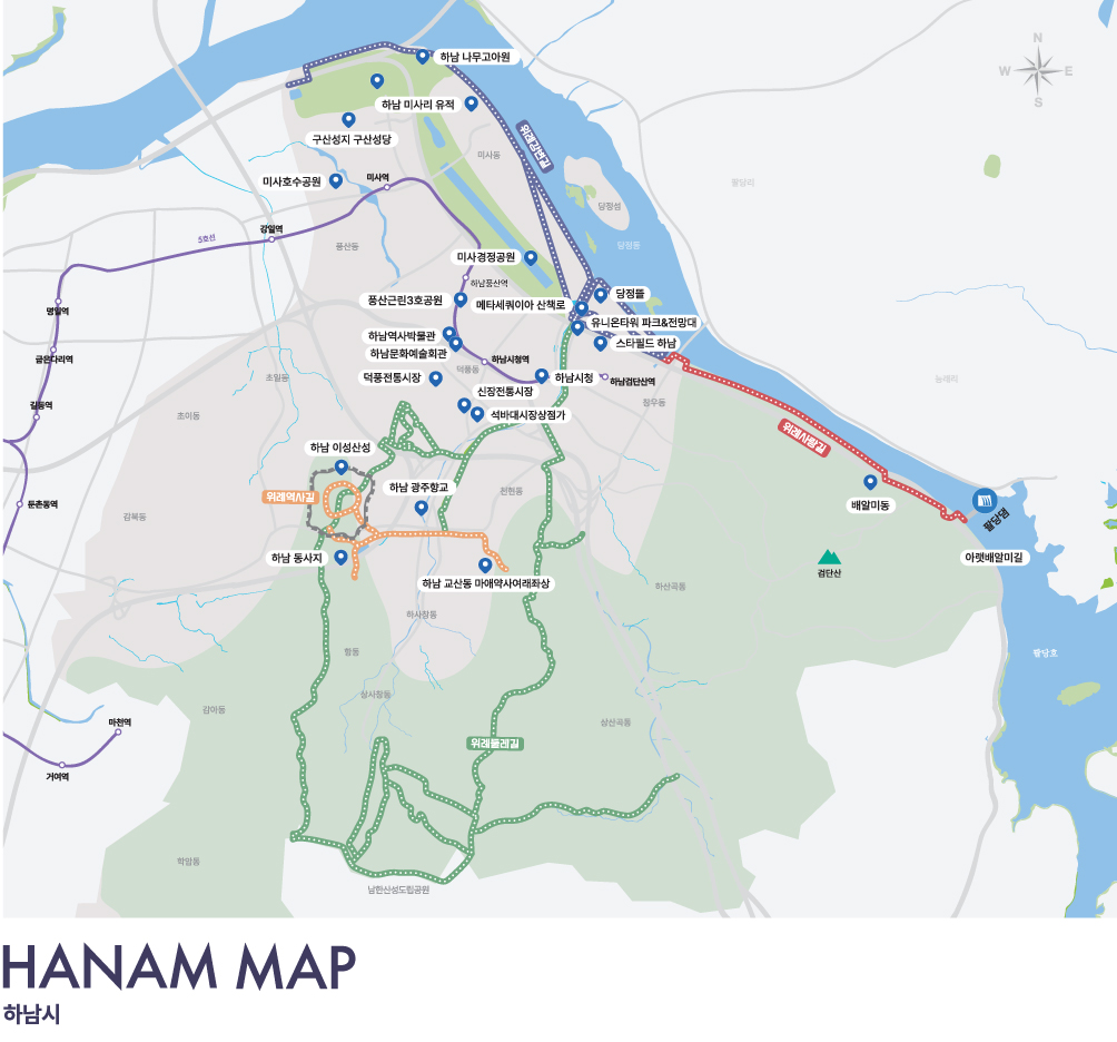 남한산성, 미사리 조정경기장, 광주향교, 검단산, 팔당댐, 스타필드 하남 등이 유명하다.
