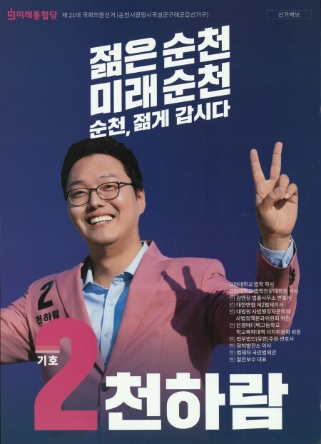 천하람은 "연고도 없는 저에게 표를 준 4천여명의 순천 시민에게 감사하다"며 아예 순천에서 변호사 사무실을 새로 개업해 순천 시민으로 뿌리를 내리고 살며 다음에도 이 선거구에 도전하겠다는 포부를 밝혔다.